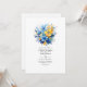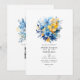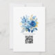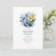 Convite de casamento floral azul elemental com acentos de ouro. Ideal para um casamento no jardim. O código QR no verso direciona para o site do seu casamento, onde as pessoas podem saber mais e responder.