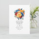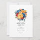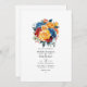 Convite de casamento floral azul, laranja, amarelo e vermelho. Ideal para qualquer tema ou casamento de jardim. O código QR no verso direciona para o seu local de casamento onde o pessoas pode aprender mais e rsvp