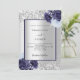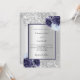 Fundo de aspecto fino prateado decorado com flores azuis e azuis-marinhos, flores e brilho fino prateado, brilhos. Personalize e adicione seus nomes e detalhes do casamento. Letras negras.