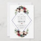 Design de cartão elegante, com uma bela broca de cor d'água, buquês de flores azuis de merlot e marinho, em forma de diamante duplo, em branco e atrás das mesmas flores em fundo azul marinho. Pode ser uma escolha excelente para qualquer casamento da temporada, especialmente para casamentos outono e inverno. Use a ferramenta Personalizar para adicionar suas informações e fazer alterações. Para obter itens correspondentes, visite minha Coleção Geométrica Floral do Marinho Merlot.