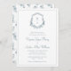 Convite para Casamento Floral Azul Monograma. Este convite romântico e na moda apresenta lindas flores azuis poeirentas pintadas manualmente em uma crista | coroa com o monograma da noiva e do noivo. A parte traseira do convite inclui um padrão de capricho, mas pode ser facilmente apagada se preferir. Localize itens correspondentes na Coleção de Crest Monograma Azul Dusty.