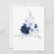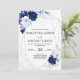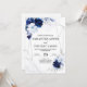 Convite de casamento com tema azul real branco prata elegante com buquê elegante de flores de rosa azul real, azul marinho, prata, botões de flores brancas puras e folhas de eucalipto verde sálvia.