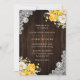 Convite de casamento floral russo, com um buquê de flores amarelas, pessegueiras e brancas e verde contra um fundo de madeira de celeiro adornado com rendas florais brancas. Design de cartão perfeito para convidar seus convidados para sua festa de casamento rústica amarela.