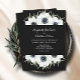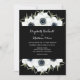 Uma elegante aquarela de flores de anêmona preto e branco e folhas sobre fundo preto, seus detalhes da cerimônia de casamento em letras brancas chic na frente e seus detalhes de casamento estão na parte de trás disso tudo em um convite. CORRESPONDENDO a itens na nossa loja.