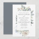 Ponha o tom para o seu dia especial, convidando as buscas com os nossos convites para casamento Românticos da Watercolor White Floral. Os elegantes convites para casamento floral mostram seus detalhes de casamento emoldurados por flores brancas de aquarela, cinzas verdes e ardentes/folhagem azul clara. Os belos convites de casamento revertem para uma sólida cinza de ardósia.