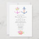 Marinho de tendências e convites para casamentos náuticos de tema branco com âncora floral de cor d'água e faixa de marinho no sentido inverso.