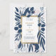 Este maravilhoso design de convite de casamento apresenta elegantes convites para casamentos florais de marinho azul, rosa e ouro desenhados à mão, que são perfeitos para qualquer cerimônia elegante e sofisticada. Esta elegante floral tropical é perfeita para a moda e casal. Personalize este design com sua mensagem e informações personalizadas. Todas as designs são impressas.