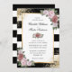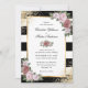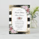 Convide seus hóspedes para sua festa de casamento escura e preta com estes elegantes convites para casamento florais com flores rosas e pincéis contra um fundo listrado preto e branco adornado com confete de ouro. Itens correspondentes disponíveis.