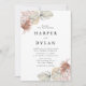 Convites de casamento tropicais elegantes, modernos, com detalhes de seu casamento com arranjos de flores aquáticas e folhagem tropical em tons de rosa, cor de rosa, bege, ferrugem, castanho, sábio e verde-escuro nos cantos. Os convites de casamento tropicais revertem para um fundo de aquarela verde sábio.