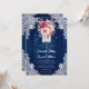 Azul-marinho russo e convite floral de blush apresentando um buquê de dahlias de blush e blush e dentro de mason verde contra um fundo de madeira azul-celeiro adornado com rendas florais brancas e luzes de cordas. Design de cartão perfeito para convidar seus convidados para o marinho azul e para a festa de casamento rústica.