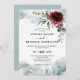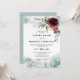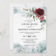 O convite para casamentos no inverno de neve elegante apresenta um buquê elegante de burgundy / marsala com flor de cor d'água, bagas e eucalipto com verde de aba gelada e flocos de neve em queda. E uma elegante paisagem de montanha de aquarela com uma rena. Maravilha perfeita do inverno, temeu design para celebrar seu grande dia.