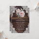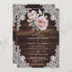 Convite de casamento floral russo com flores cor-de-rosa contra um fundo de madeira rústica adornado com rendas florais brancas. Personalize facilmente este elegante convite de casamento para complementar o seu país rústico, ou festa de casamento de celeiro.
