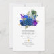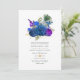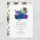 Marinho elegante e convite para casamento de rosas azuis reais com sotaques de púrpura em um tema de pavão barroco personalizável para seus eventos específicos.