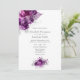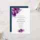 Rosas roxos de ameixa escura e convites de casamento folhosos tropicais com brilho prateado com lavagem de cor azul marinho à água.