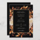 Convite De Casamento Floral Preto. Este elegante convite para o casamento contém lindas rosas pintadas à mão, cor d'água queimada, laranja e folhas de terracota, creme e beige, e belas ferrugem e marrom em fundo branco, perfeito para um casamento de outono! A parte de trás do convite tem um belo galho de folhas com a noiva e o monograma do noivo. Localize itens correspondentes na Coleção de Casamentos Romance de outono Preto.