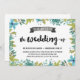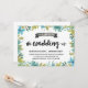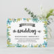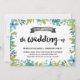 Este bonito convite para casamento do tema jardim do quintal apresenta uma bela borda azul e verde da coroa floral, bonito caligrafia do pincel e um banner rústico do quadro chic.