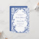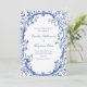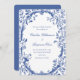 Convide seus convidados com charme de eterno usando este elegante convite de casamento com uma fronteira azul clássica e floral. Inspirada pelo estilo francês do país, a intrincada estrutura botânica e a tradicional serifa e tipografia de guião deram um tom romântico para o seu dia especial. Perfeito para casamentos vinícolas, cerimônias de jardim ou qualquer casal que busque elegância de vintage refinada com um toque suave e pessoal.
