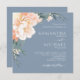 Aqui está um convite estonteante para o seu próximo casamento. Este design apresenta peonias elegantes e rosa-buds em tons de pêssego e creme embebidos em folha de ouro falso juntamente com o verde-folhagem de eucalipto e seus detalhes de casamento, facilmente personalizados, em um lindo fundo azul empoeirado. A parte traseira do cartão também é azul empoeirado e está disponível para quaisquer detalhes ou fotos adicionais que você gostaria de adicionar aos seus convites. Se você tem uma pergunta design ou gostaria de ver este design em outro produto, por favor sinta-se à vontade para me enviar uma mensagem. Aproveite! Design © Judith Schmidt.