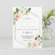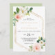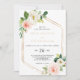 Este convite de casamento floral geométrico e elegante, verde e ouro é perfeito para um casamento rústico. A design apresenta rosas brancos, cor-de-rosa e pincéis pintados à mão e um toque de verde, adoráveis quadros geométricos de ouro, inspiradora beleza artística.