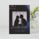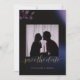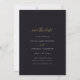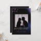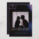 Alguns ramos de folhas de eucalipto, desenhadas à mão em lápis colorido e revestidas com tons de poeirento e roxo escuro, fazem um casamento moderno, sofisticado, elegante e chic, salvo a data. O fundo azul preto e escuro com pistas de roxo e luzes iluminam o céu da meia-noite. A elegante escrita caligráfica, na matiz do ouro, torna esse design na moda preto e roxo ainda mais elegante. Um plano de fundo mais escuro funciona melhor como uma imagem para salvar o cartão de data.