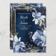 Convite Casamento Floral em Aquarela Azul Naval e Dourado