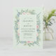 Este design apresenta um fundo suave em verde menta complementado por uma borda floral em aquarela exuberante. Rosas cor-de-rosa delicadas e flores azul claro são combinadas com eucalipto dólar de prata e folhagem de salva. A estética geral é romântica e arejada, tornando-a uma escolha perfeita para um evento de primavera sazonal.