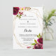 Este convite de casamento floral floral de burgundy geométrico é perfeito para um casamento simples. O design apresenta flores cor-de-água, cor-de-rosa, esbranquiçadas, vermelhas, arrojadas e bordo, com folhagem verde, enfeitando uma moldura geométrica dourada.