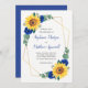 Estes convites para o casamento apresentam um design floral de aquarela com girassóis, rosas azuis e folhas de eucalipto numa falsa estrutura geométrica dourada. Personalize com seu próprio texto. A suíte de casamento também está disponível.