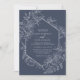 A cor elegante e o design geométrico tornam este convite espantoso. Este design apresenta um fundo azul marinho, um adorável desenho botânico floral desenhado, e tipografia personalizada com uma borda geométrica na frente. O verso apresenta uma lindíssima tapeçaria floral.