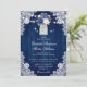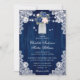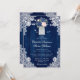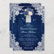 Marinho russo azul-país e blush convite floral de casamento apresentando um buquê de rosas e flores de hálito de bebê dentro de jarro contra um fundo de madeira de celeiro adornado com rendas florais brancas e luzes de cordas. Design de cartão perfeito para convidar seus hóspedes para sua marinho azul e blush da festa de casamento do país russo. Personalize facilmente este convite de casamento com os seus detalhes de casamento online. Design totalmente personalizável. Itens correspondentes disponíveis.