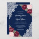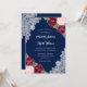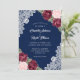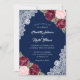 Elegante marinho rústico azul, burgundy e rosa pincelado convite para o casamento floral com hálito de bebê, burgundy e rosas cor-de-rosa pinceladas em um fundo azul marinho de burlap, adornado com rendas florais brancas. Design de cartão perfeito para convidar os seus convidados para a sua festa de casamento azul marinho, burgundy e blush rustic. Itens correspondentes disponíveis.