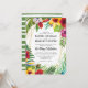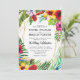 Convites de casamento em destino de praia com um fundo branco chic que pode ser alterado para qualquer cor, brilho dourado, design de borda geométrica, flores tropicais aquarela, folhas de palmeira e um modelo de casamento que é fácil de personalizar.