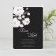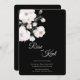 Delicada rosas brancas no canto superior esquerdo deste convite de casamento preto elegante e minimalista. Detalhes do convite de casamento na tipografia das cinzas.