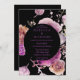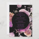 Mostrando um tema roxo e preto, este convite de casamento mostra um design floral roxo leve em um fundo preto. O texto é escrito em cor roxa. Personalize seu convite hoje!