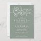 Convites florais elegantes com flores brancas esboçadas e folhas perto do topo do convite com um fundo verde sábio. Personalize o convite de casamento botânico com seus nomes e detalhes de casamento abaixo em letras brancas clássicas. Projetado para coordenar com a nossa coleção de casamento Floral.