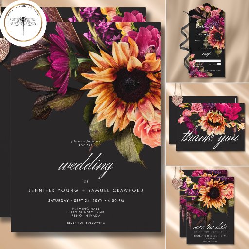 Abraçar a beleza opulente de um pôr do sol de verão ou as matizes ricas de uma colheita de outono com nosso convite de casamento cativante. Um fundo preto dramático, mas macio, proporciona a canvas perfeita para um buquê surpreendentemente realista. Imaginem uma vibrante explosão de cor, apresentando mães em magenta profunda e roxo, com rosas cor-de-rosa macia ao lado de girassóis laranja de ouro ousados. Folhagem verde escura e escura completa o arranjo, adicionando um toque de elegância natural. Este design cativante é perfeito para qualquer estação, refletindo a intensidade apaixonada da sua história de amor. Seus detalhes de casamento são mostrados em um roteiro elegante, garantindo que eles se destacam lindamente contra o cenário dramático. Esta suíte encantadora cria um convite inesquecível para celebrar seu dia especial. Criado pela imprensa simplesmente de farmácia.