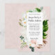 Lindas flores tropicais de aquarela e verde em um fundo de lavagem cor-de-rosa. As flores estão em cores de branco e esbranquiçadas com um verde esmagador. Orquídeas brancas opulentas, proteas rebeldes brancas, magnólias e verde profundo.