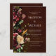 Bela buquê de burgundy e creme de flores misturadas a verdes que cercam fontes modernas feitas em branco sobre fundo elegante e profundo de burgundy foram usadas para criar este convite moderno ao casamento. Perfeito para qualquer casamento. Coordenando burgundy no lado inverso. Absolutamente espantoso!