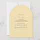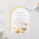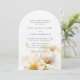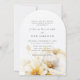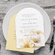 Convite de casamento elegante e romântico com grande bouquet de flores brancas, amarelas e douradas na parte inferior e detalhes do casamento no verso.