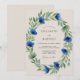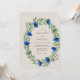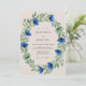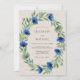Uma delicada grinalda de vibrantes flores reais azuis e folhagens verdejantes circunda os elementos centrais. Este design evoca uma atmosfera romântica e clássica, perfeita para uma ocasião memorável. A paleta de cores proeminente apresenta azuis profundos e verdes terrosos.