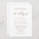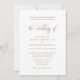 Aprecie seus convidados com este belo convite de casamento com detalhes elegantes e modernos de caligrafia escrita à mão. Elegante habilidade minimalista, simples e clássica. Nota: a tipografia não está em folha real, mas na impressão de preferencialmente em uma matiz de ouro. Em branco, que pode ser alterado para qualquer outra cor de fundo que você quiser selecionando "personalizar mais". Palavras com nomes de pais. Parte da nossa coleção "Casamento Minimalista da Caligrafia Elegante". Visite a coleção inteira em: https://www.zazzle.com/collections/elegant_calligraphy_minimalist_wedding_stationery-119497981924462546