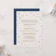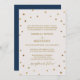 Este convite formal de casamento para bolinhas de ouro é perfeito para um casamento elegante. O simples design apresenta um confete de ouro chic sobre um fundo de champanhe cremoso com uma bela caligrafia de folha de ouro falsa e um marinho de cobertura azul. Nota: Este design não apresenta folha de ouro real. É um gráfico de alta qualidade feito para se parecer com folhas de ouro. Para obter mais opções de texto de convite para casamento, consulte a coleção completa de casamento de bolinhas de ouro: https://www.zazzle.com/collections/119263882092239442