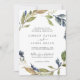Este convite formal de casamento verde no outono é perfeito para um casamento outono. A design moderna rústica apresenta folhas azuis marinhos, verdes-sábios e douradas com espirros de flores azuis escuras.