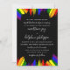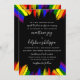 Convite formal para o casamento LGBT em preto com fontes encantadoras e bandeira de orgulho pintam traçados moldando a redação formal do casamento em texto branco contra fundo preto.