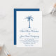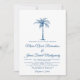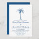 Convide seus convidados para ajudá-lo a comemorar seu dia especial com este convite elegante que inclui um roteiro moderno e texto azul com uma palmeira artística. Um fundo azul sólido de coordenação está na parte traseira da placa. Perfeito para uma praia ou um local de casamento ao ar livre. Se precisar de ajuda ou de um pedido personalizado, entre em contato com laura@purplecatarts.com
