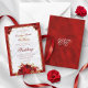 Aproveite o luxo a um preço de barato com este elegante convite de casamento floral vermelho. Um fundo metálico vermelho, uma cebola branca e uma moldura de joias de filigrana dourada combinam-se com rosas vermelhas ricas para o melhor e elegante design de casamento. O texto burgundy em fontes formais clássicas pode ser facilmente personalizado para seu próprio dia especial. No verso está um monograma decorativo em cores complementares.