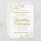 Este belo convite de casamento é na moda, simples e elegante. Ele apresenta letras douradas em um fundo branco com filtro floral de folha falsa em cada canto. A design subestimada é compensada pelas ampolas e espirais do trabalho de arte.