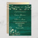 Anuncie seu casamento com um convite elegante e moderno. Esta rustic formal emerald green design apresenta boho gold floral lace, string light e simples script de caligrafia.