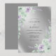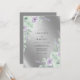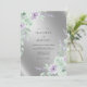 Este design apresenta um fundo metálico prateado brilhante que cria um clima sofisticado e luminoso. Rosas suaves em tons de lavanda e lilás em aquarela são combinadas com folhagens delicadas em verde-sage. Os elementos botânicos etéreos oferecem uma estética graciosa e romântica perfeita para um evento formal de inverno ou primavera.