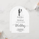 Este elegante convite de casamento de Arco Negro e Branco é perfeito para um casamento moderno. O simples design apresenta uma caligrafia preta elegante e uma ilustração noiva e noiva sobre um fundo branco limpo. O cartão de convite inclui os detalhes do casamento no verso, em vez de pagar um cartão separado.